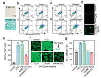| Fig. 3. Intracellular delivery of bioactive enzymes. (a) Cytosolic delivery of β-Gal by Gru88 in 143B cells, determined by X-gal staining. (b) Apoptosis ratio of 143B cells treated with saporin, Gru88, and Gru88/saporin complexes. The concentration of saporin and Gru88 were 0.01 and 25 µg/mL, respectively. (c) Apoptosis ratio of 143B cells treated with RNase A, Gru88, and Gru88/RNase A complexes. The concentration of RNase A and Gru88 were 0.5 and 25 µg/mL, respectively. (d) Confocal images of 143B cells treated with Gru88/SOD-FITC for 0.5 h. (e) FI of ROS in RAW264.7 cells. RAW264.7 cells were pretreated with LPS (1 µg/mL) for 12 h, followed by incubation with the Gru88/SOD complexes for 0.5 h. Confocal images (f) and FI (g) of ROS in 143B cells. The cells were pretreated with Gru88/SOD for 0.5 h, followed by incubation with H2O2 (500 µmol/L) for 0.5 h. The concentrations of Gru88 and SOD were 25 and 40 µg/mL, respectively. Data are presented as mean ± s.d. (n = 3). nsP > 0.05, P < 0.05, **P < 0.01, ***P < 0.001. | |