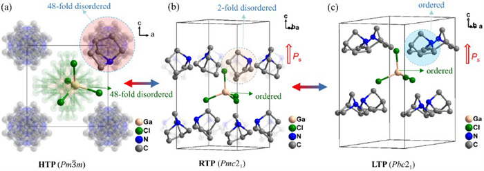 The RTP becomes orthorhombic space group Pmc21, as shown in Fig. 2b, in which the 1-azanorbornanium cations exhibit two-fold disorder, and the molecules align along the c axis, leading to the emergence of spontaneous polarization. This HTP-RTP phase transition belongs to a ferroelectric one with Aizu notation of