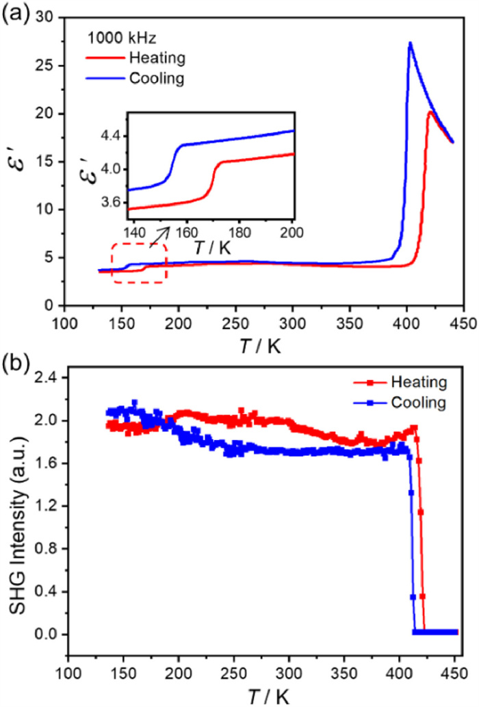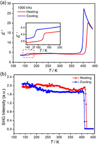 | Fig. 3. (a) Temperature-dependent dielectric constants (ε’) for 1 measured at 1000 kHz during a heating-cooling cycle. Insets provide magnified views of specific regions for clarity. (b) The temperature-dependent SHG measurements for 1. | |