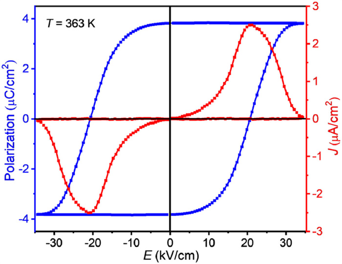 | Fig. 4. The J-E curve and P-E hysteresis loop along the c axis direction of 1 at 363 K. | |