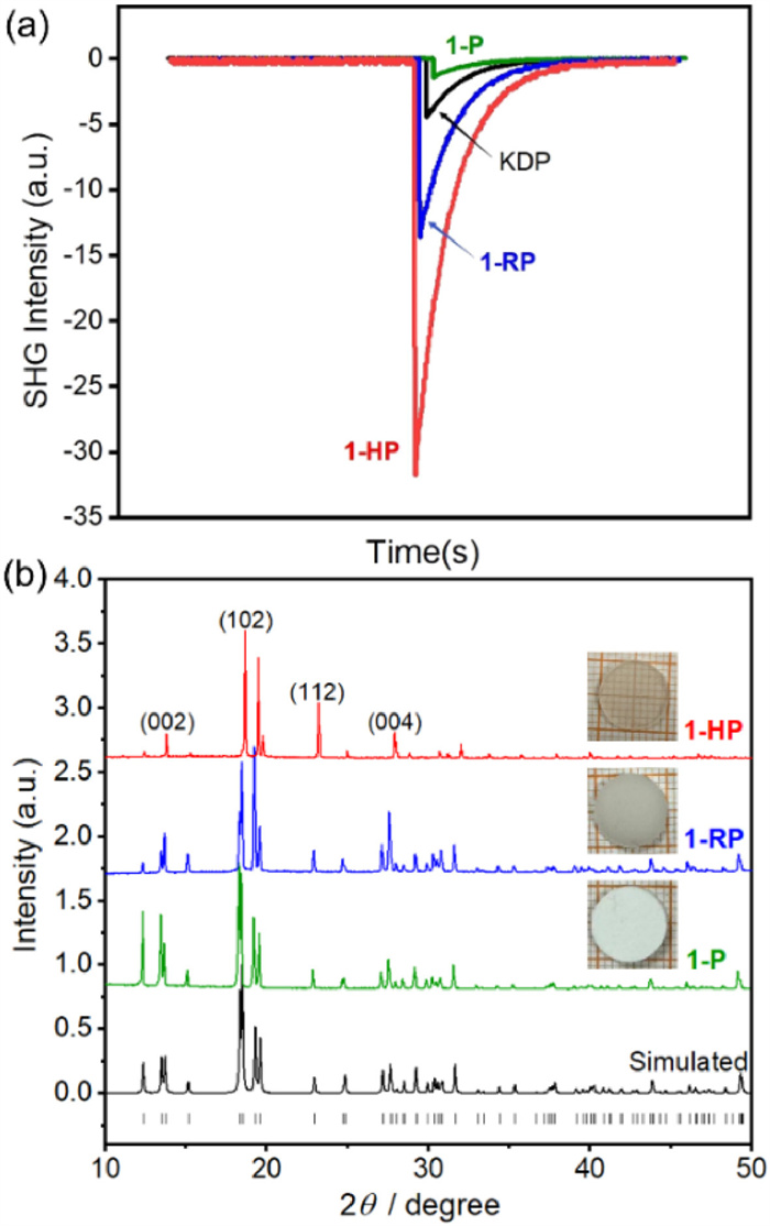 | Fig. 5. (a) SHG signals of 1 in different forms: 1-HP (hot-pressed at 433 K, 1.1 MPa, 1 h), 1-RP (pressed at 298 K, 5 h), and 1-P (loose powder). (b) Corresponding PXRD patterns and optical photographs. | |