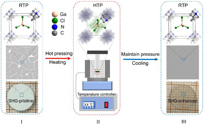 In this study, we selected 1-azanorbornanium cation and GaCl4− anion to assemble plastic crystal. The spheroid-like shape and moderate size of the polar 1-azanorbornanium cation optimizes the plastic phase transition and ferroelectric properties [26], while the GaCl4− anion exhibits high transparency, excellent thermal stability, and strong SHG effects, showing great potential for optical applications [27-30]. Our efforts yielded a new ferroelectric plastic crystal, (C6H12N)[GaCl4] (1), which crystallizes in the polar space group Pmc21 at room temperature and undergoes plastic phase transition at above 413 K. As shown in Scheme 1, we utilized an improved hot-pressing process, i.e., applying pressure at above plastic transition temperature and cooling back to room temperature with maintained pressure, to transform the loose powder sample of 1 into a dense tablet sample with significantly enhanced transparency and nonlinear optical performance. The hot-pressing process optimized densification and grain orientation, improving optical consistency and enhancing nonlinear optical properties [31-33]. This study highlights the potential of combining plastic crystal phase transitions with hot-pressing technology, providing a new approach for developing high-performance SHG materials.