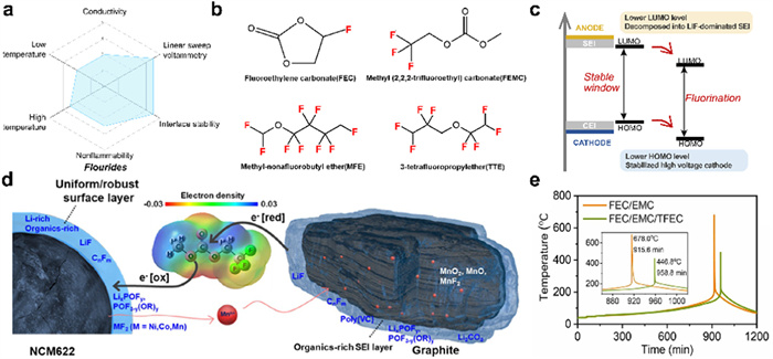 | Fig. 4. (a) Radar chart of relevant properties of fluorides. (b) Structural formulae of commonly used fluorides. (c) Effect of fluorination on electrolyte HOMO and LUMO levels. (d) Schematic of electrode-electrolyte interface modulation mechanism. Copied with permission [66]. Copyright 2020, Elsevier. (e) ARC test results of the NCM811 pouch cell. Copied with permission [65]. Copyright 2023, Elsevier. | |