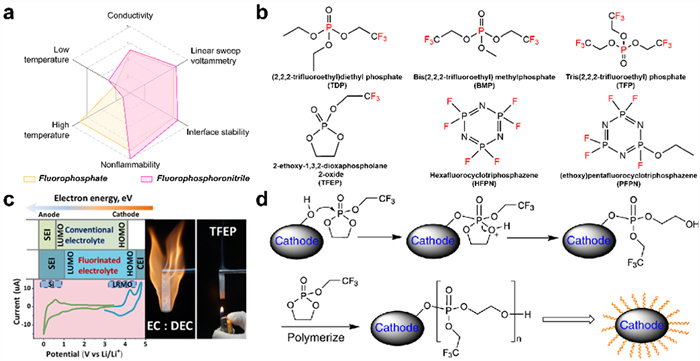 | Fig. 5. (a) Radar plots of the properties of fluorophosphates and fluorophosphonitriles. (b) Structural formulae of fluorinated phosphates and fluorinated phosphonitriles. (c) Schematic of the electrochemical window of the TFP-based electrolyte and photographs of the flame ignition test. Copied with permission [82]. Copyright 2020, John Wiley and Sons. (d) TFEP cathode interface CEI construction mechanism. Copied with permission [88]. Copyright 2020, Springer Nature. | |