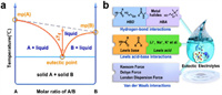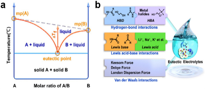 | Fig. 6. (a) Phase diagram of eutectic electrolytes with two components, and (b) formation mechanisms of eutectic electrolytes. Copied with permission [107]. Copyright 2021, American Chemical Society. | |