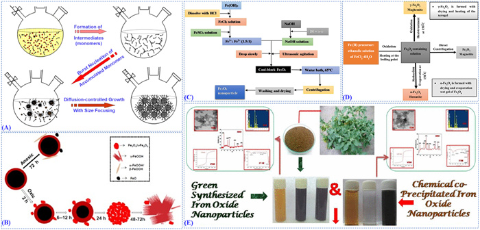 | Fig. 1. (A) Schematic illustration of the “heat-up” method for the synthesis of uniformly sized iron oxide nanoparticles. Copied with permission [28]. Copyright 2015, American Chemical Society. (B) Evolution of nanoscale zero-valent iron (nZVI) in water. Copied with permission [35]. Copyright 2015, Elsevier B.V. (C) Preparation scheme of magnetite (Fe3O4) nanoparticle via co-precipitation method. Copied with permission [26]. Copyright 2021, Elsevier B.V. (D) Processing steps of Fe3O4, α-Fe2O3, and γ-Fe2O3 nanoparticles. Copied with permission [26]. Copyright 2021, Elsevier B.V. (E) The co-precipitation method was used for the synthesis of iron oxide nanoparticles by using green and chemical-based materials. Copied with permission [38]. Copyright 2018, Springer Science Business Media. | |