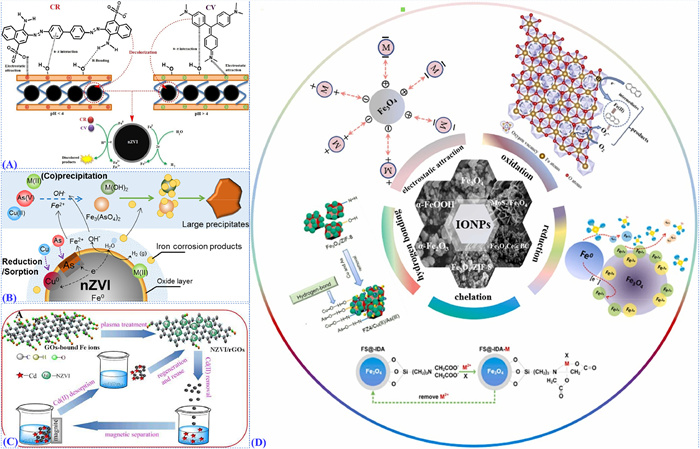 | Fig. 2. (A) Removal mechanism of Congo red dye and crystal violet onto the nZVI@nBent–CMC composite. Copied with permission [44]. Copyright 2021, American Chemical Society. (B) Schematic of heavy metal removal using nZVI. Copied with permission [48]. Copyright 2016, Elsevier B.V. (C) Possible schematic mechanisms and reaction process of heavy metal ion removal by NZVI/rGOs and ZVI/ZVAl. Copied with permission [49]. Copyright 2016, American Chemical Society. (D) Proposed mechanisms of pollutant removal by IONPs. Copied with permission [50]. Copyright 2023, Elsevier B.V. | |