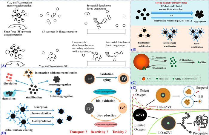 | Fig. 3. (A) Conceptual model of agglomeration of modified nanoscale iron particles followed by deposition of clusters. Copied with permission [69]. Copyright 2009, American Chemical Society. (B) Illustration of the aggregation behavior of iron-based nanoparticles. Copied with permission [71]. Copyright 2018, Elsevier Ltd. (C) Dissolution, adsorption, and hydrolysis in iron-based nanoparticles suspensions [72]. (D) Potential transformations of iron-based nanoparticles in the environment. Copied with permission [71]. Copyright 2018, Elsevier Ltd. (E) Oxidation of nanoscale zero-valent iron under sufficient and limited dissolved oxygen. Copied with permission [74]. Copyright 2015, Elsevier Ltd. | |