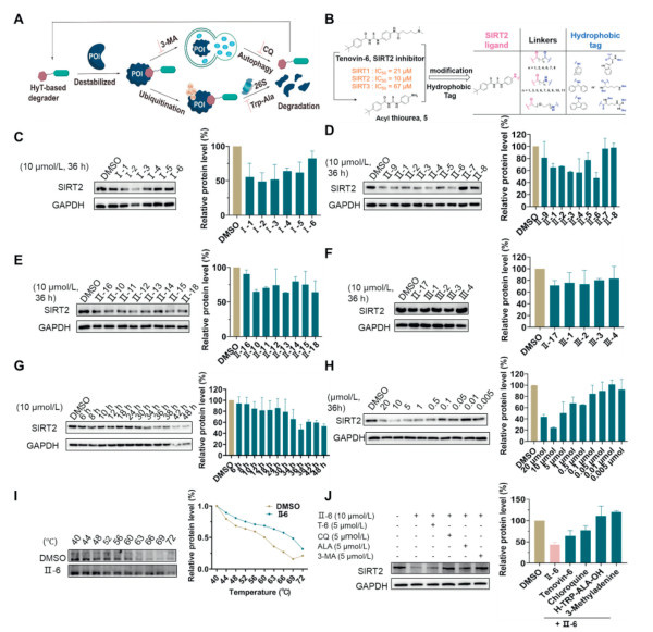 | Fig. 1. Degradation activity of these HyT degraders evaluated. A2780 cells were individually pretreated with 10 µmol/L degraders for 36 h before protein level analysis. (A) The mechanism of SIRT2 degradation induced by HyT degraders. (B) Design of ultimate degraders based on acyl thiourea skeletons. (C) Western blot assay was performed to examine the degradation activity of amantadine series degraders Ⅰ-1–6. (D) Degradation activity of Boc1-Trp series degraders Ⅱ-1–9. (E) Degradation activity of Boc2-Lys series degraders Ⅱ-10–16 and Ⅱ-18. (F) Degradation activity of Boc3-Arg series degrader Ⅱ-17 and Ⅲ-1–4. (G) Western blot analysis showed that Ⅱ-6 degraded SIRT2 protein in a time-dependent manner. (H) SIRT2 protein was degraded in a dose-dependent manner. (I) The CETSA assay of Ⅱ-6. (J) Ⅱ-6 induced SIRT2 degradation through proteasome-mediated proteolysis and the autophagy lysosome pathway. Data are presented as mean ± standard deviation (SD) (n = 3). GAPDH, glyceraldehyde-3-phosphate dehydrogenase; CQ, chloroquine. | |