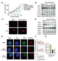 | Fig. 2. Antitumor effect in xenograft model and mechanism of Ⅱ-6 in A2780. (A) Tumor volume change of mice during the antitumor treatment. Data are presented as mean ± SD (n = 5). (B) Ⅱ-6 was associated with the SIRT2/AKT/mTOR signaling pathway. (C) The alkaline comet assay image, which showed Ⅱ-6 induced DNA damage in A2780 cells exposed to 10 µmol/L concentration. Scale bar: 100 µm for 10× image and 20 µm for 40× image. (D) Western blot was used to analyze the levels of SET8 and H4K20me1/H4K20me2 after SIRT2 degradation, as well as the levels of DNA damage markers 53BP1 and γ-H2AX. (E) CLSM analysis for H4K20me2 and 53BP1. Scale bar: 3 µm. (F) The plot profiles show fluorescence intensity variations along an oblique line, quantified by ImageJ. (G) Co-localization between two entities is assessed using Pearson coefficients, calculated by JACoP in ImageJ. | |