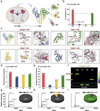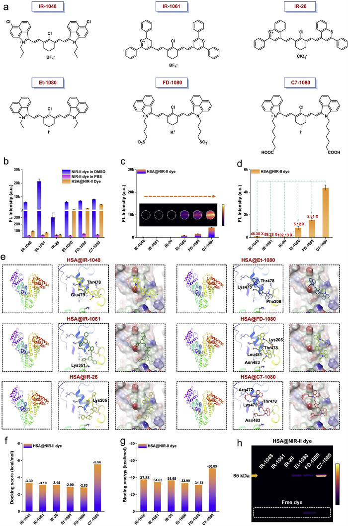 | Fig. 1. Binding behavior of various NIR-Ⅱ dyes with proteins. (a) Chemical structure formulas of the previously reported NIR-Ⅱ dyes (IR-1048, IR-1061, IR-26, Et-1080, and FD-1080) and the newly designed dye C7–1080. (b) Fluorescence intensity of NIR-Ⅱ dyes in different solutions, including DMSO, PBS, and HSA solution. (c, d) Fluorescence enhancement effect of different HSA@NIR-Ⅱ dye complexes. (e) Theoretical simulation of HSA binding to different NIR-Ⅱ dyes by gliding docking mode. (f, g) Comparison of docking score and binding energy between HSA and different NIR-Ⅱ dyes. (h) Gel electrophoresis analysis of different HSA@NIR-Ⅱ dye complexes. | |