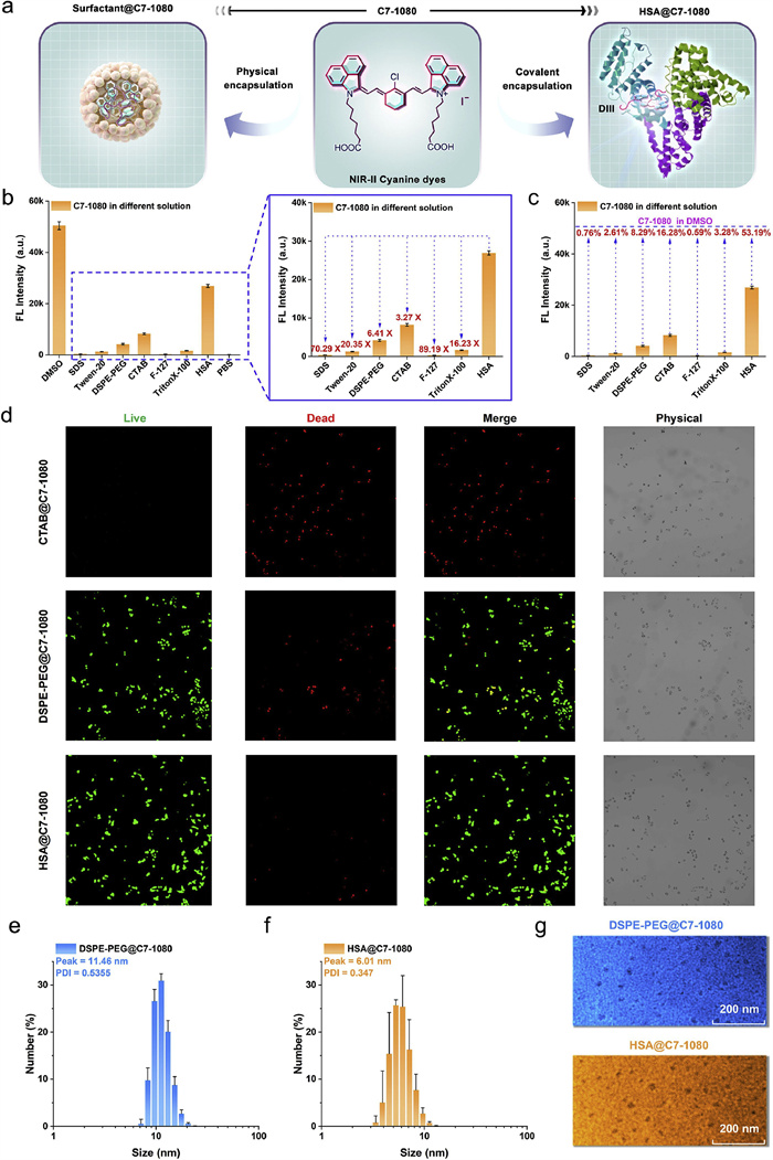 | Fig. 3. Comparison of two different encapsulation strategies for C7–1080. (a) Schematic illustration of different encapsulation strategies for C7–1080: Non-covalent encapsulation (left) and covalent encapsulation (right). (b) NIR-Ⅱ brightness comparison of HSA@C7–1080 and C7–1080 in different surfactant containing solution (the concentration ratio of surfactant to C7–1080 is 50:1). (c) Fluorescence retention comparison of C7–1080 in different surfactant solutions with that in DMSO. (d) Live-dead cell staining for CTAB@C7–1080, DSPE-PEG@C7–1080, and HSA@C7–1080 complexes. (e, f) Dynamic light scattering (DLS) analysis of DSPE-PEG@C7–1080 and HSA@C7–1080. (g) Transmission electron microscopy (TEM) images of DSPE-PEG@C7–1080 and HSA@C7–1080. | |