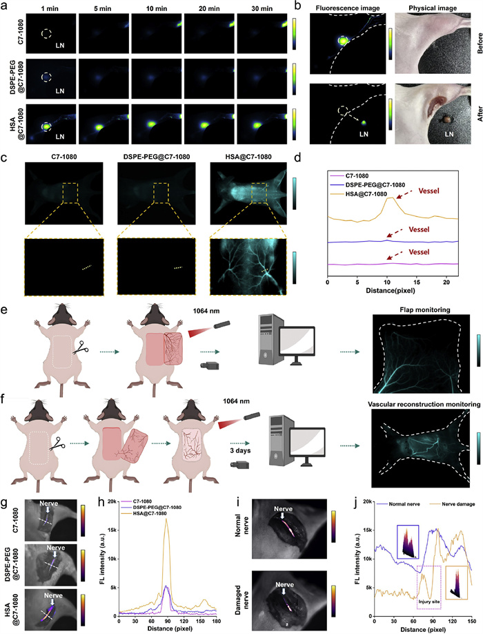 | Fig. 4. In vivo imaging behavior of C7–1080, DSPE-PEG@C7–1080, and HSA@C7–1080. (a) NIR-Ⅱ fluorescence imaging of lymph nodes at different time points after dye injection (Exposure time: 10 ms; Dosage: 25 µL (200 µmol/L)). (b) NIR-Ⅱ fluorescence guided lymph node surgical excision using the HSA@C7–1080. (c) NIR-Ⅱ imaging of dorsal blood vessels after intravenous injections of different dyes including C7–1080, DSPE-PEG@C7–1080, and HSA@C7–1080 (Exposure time: 80 ms; Dosage: 200 µL (600 µmol/L)). (d) Fluorescent cross-sectional intensity profile of vessels along the white dashed lines in Fig. 4c. (e) Schematic diagram of vascular imaging for monitoring flap transplantation and NIR-Ⅱ fluorescence imaging of flap after intravenous injection of HSA@C7–1080 (Dosage: 200 µL (600 µmol/L)). (f) Schematic diagram of monitoring the vascular reconstruction of the mouse flap model with HSA@C7–1080 and NIR-Ⅱ fluorescence imaging of reconstructed flap vessels after intravenous injection of HSA@C7–1080 (Dosage: 200 µL (600 µmol/L)). (g) NIR-Ⅱ fluorescence imaging of the mouse sciatic nerve (Exposure time: 20 ms; Dosage: 3 µL (600 µmol/L)). (h) Fluorescent cross-sectional intensity profile of nerves along the white dashed lines in Fig. 4g. (i) Assessment of nerve damage with HSA@C7–1080. (j) Fluorescent intensity profile along the nerves in Fig. 4i. For all fluorescent imaging, Laser excitation: 1064 nm with 65 mW/cm2; Filter: 1200 nm long-pass filters. | |