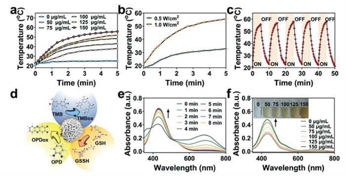 | Fig. 1. Photothermal and enzyme-like property of MnO2. (a) Photothermal heating curves of MnO2 dispersions at different concentrations under 808 nm laser irradiation (1.0 W/cm2). (b) Photothermal heating curves of MnO2 dispersion (150 µg/mL) at different laser power intensities. (c) Photothermal stability (five on/off laser cycles) of MnO2 dispersion. (d) Schematic diagram of the catalytic action of MnO2 nanozyme. (e) The OXD-like activity of MnO2 dispersion using OPD as substrate at various times. (f) The OXD-like activity of MnO2 dispersion using OPD as substrate at various concentrations. | |