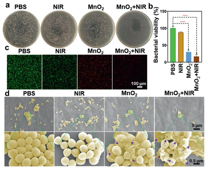 | Fig. 2. Antibacterial activity of MnO2 in vitro. (a) Photographs of MRSA colonies incubated with MnO2 under various conditions, including group 1: PBS, group 2: NIR (808 nm, 1.0 W/cm2, 5 min), group 3: MnO2 (150 µg/mL), and group 4: MnO2 + NIR. (b) Quantitative analysis of bacterial viability of MRSA from Fig. 2a. (c) Representative CLSM images of a live/dead staining assay for MRSA administered different treatments are presented. Scale bar: 100 µm. (d) SEM micrographs were administrated. Scale bar: 5 µm and 0.5 µm. Data are presented as mean ± SD (n = 3). ****P < 0.0001. | |