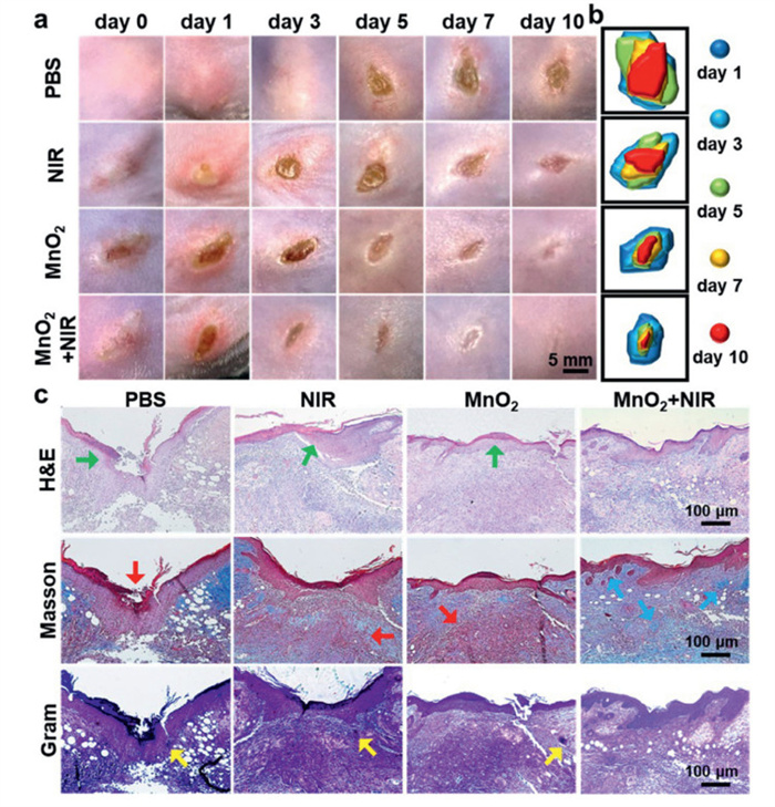 Previous studies have demonstrated the remarkable in vitro antibacterial activity of MnO2. This study investigates the in vivo efficacy using a subcutaneous abscess model in MRSA-infected mice. All animal experiments were approved by the Institutional Animal Welfare and Ethics Review Committee of Wenzhou National Institute of Science and Technology (Wenzhou Institute of Biomaterials and Engineering Biology, WIUCAS24072202). The experimental procedure is illustrated in Fig. S6a (Supporting information). During the experiment, the wound temperature reached the therapeutic level (Fig. S6b in Supporting information). The body weight of the mice showed a steady increase (Fig. S6c in Supporting information). Representative wound images are displayed in Fig. 3a, demonstrating that wound healing in the MnO2 group was superior to that in both the PBS and NIR groups. Interestingly, the wounds in the MnO2 + NIR group exhibited a more complete healing status. The simulated wound area maps and quantitative analysis results (Fig. 3b and Fig. S6d in Supporting information) indicated that the final wound area ratios for the PBS group, NIR group, MnO2 group, and MnO2 + NIR group were 47.06%, 33.60%, 17.91%, and 4.89%, respectively. The bacterial plate counts of the wound tissues, as shown in Figs. S6e and f (Supporting information), indicated a reduction of 1.7 logCFU/mL (colony forming unit is abbreviated as CFU) in bacterial residue for the MnO2 + NIR group. The therapeutic efficacy of MnO2 in vivo was further evaluated through histopathological staining techniques, including hematoxylin and eosin (H&E), Masson, and Gram staining (Fig. 3c). H&E staining (the green arrow points to the scab of the wound and the inflammatory cells) revealed that the MnO2 + NIR group exhibited more intact skin morphology and a lower percentage of inflammatory cells (18.61%) (Fig. S7a in Supporting information). The Masson trichrome staining method was employed to assess collagen deposition in the tissue. Red arrows indicate a significant number of fibrocytes that impede tissue healing. In contrast, blue arrows in the MnO2 + NIR group highlight a large number of newly formed collagen fibers within the tissue, which is advantageous for wound healing (Fig. S7b in Supporting information). Additionally, Gram staining of the wound tissue revealed residual bacteria indicated by the yellow arrow (Fig. S7c in Supporting information). Macrophages play a crucial role in wound healing. This study conducted immunofluorescence analysis on the M1 marker protein inducible nitric oxide synthase (iNOS) (Figs. S8a and b in Supporting information) and the M2 marker protein Arginase 1 (Arg1) (Figs. S8c and d in Supporting information) in wound tissues. The expression of iNOS was most prominent in the PBS group, while the green fluorescence was weakest in the MnO2 + NIR group. Conversely, Arg1 exhibited the strongest fluorescence in the MnO2 + NIR group. The results of the immunofluorescence staining indicate that the expression of M2 macrophages was significantly higher in the MnO2 + NIR group, which effectively promoted the phased healing of the wound. Comparisons of iNOS and Arg1 expressions across the MnO2 + NIR treatment group revealed that this group exhibited the lowest levels of iNOS, indicating enhanced wound healing. Neovascularization is a critical indicator of wound healing, with higher expression of the CD31 marker associated with improved neovascularization. As shown in Figs. S8e and f (Supporting information), the MnO2 + NIR group demonstrated the highest CD31 expression. Overall, the combined photothermal and catalytic activity of manganese dioxide exhibited exceptional antibacterial and pro-inflammatory efficacy in vivo.