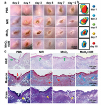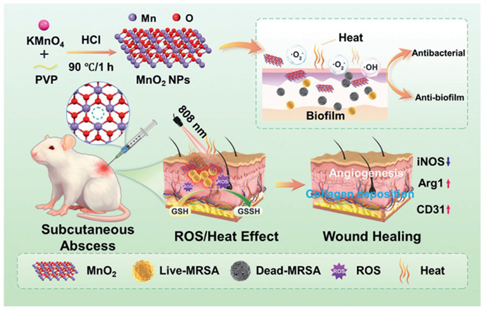 | Scheme 1. The description of the synthesis of MnO2 NPs and the efficacy of 808 nm laser irradiation to enhance the enzyme-like activity of MnO2 on MRSA-infected abscesses in vivo. | |