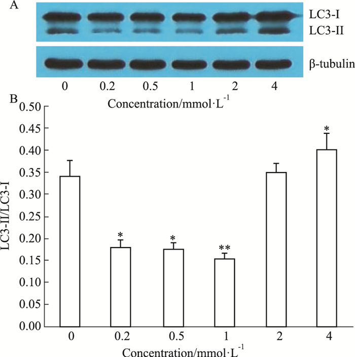 | Fig 1 Effect of adenosine on autophagy in HepG2 cells (x±s, n=3) A: Western blot showed LC3-Ⅱ and LC3-Ⅰ expression in HepG2 cells incubated with adenosine (0.2, 0.5, 1.0, 2.0, 4.0 mmol·L-1) for 24 h; B: Quantitative analysis of the ratio of LC3-Ⅱ/LC3-Ⅰ. *P < 0.05, **P < 0.01 vs 0 mmol·L-1 group. |
