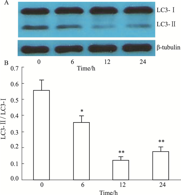 | Fig 2 Effect of adenosine (1.0 mmol·L-1) on autophagy in HepG2 cells in 24-hour period(x±s, n=3) A: Western blot assay showed LC3-Ⅱ and LC3-Ⅰ expression in HepG2 cells; B: Quantitative analysis of the ratio of LC3-Ⅱ/LC3-Ⅰ. *P < 0.05, **P < 0.01 vs 0 h group. |