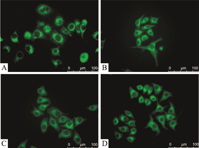 | Fig 3 Autophagosomes reduced by adenosine (1.0 mmol·L-1) in HepG2 cells showed by MDC A: Autophagosomes at 0 h; B: Autophagosomes at 6 h; C: Autophagosomes at 12 h; D: Autophagosomes at 24 h. In 24 h period, minimal autophagosomes were observed at 12 h detecting point. |