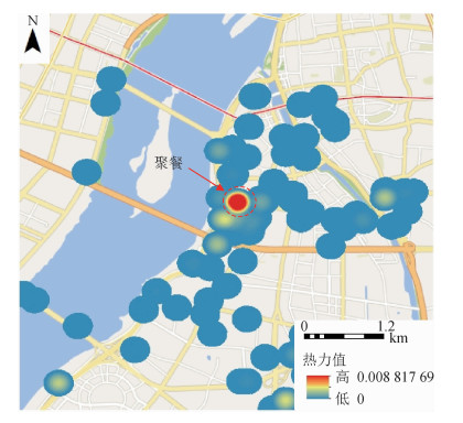 | 图 1 一起南昌市新型冠状病毒肺炎聚集性疫情1月11—12日聚餐人员轨迹热力图 |