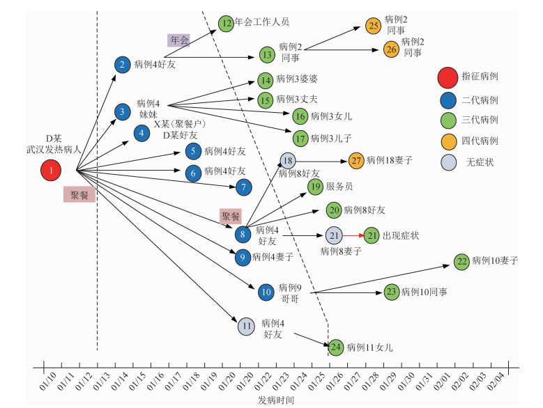 D某1月10日从武汉市来到南昌市,出现发热症状,未做新型冠状病毒检测符合疑似病例。1月11-12日聚餐后共有10人发病,且在发病前14 d均无武汉市旅行史和其他可疑暴露史。由此推测,此次疫情的传染源为疑似病例D某,发病时间为1月10日。