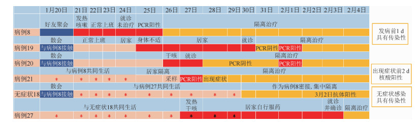 3.特殊病例:“病例8”于1月20日与7个好友聚餐、聚会,共导致2个好友与1个服务员发病,1月21日“病例8”出现症状,发病前1 d具有传染性;“病例8”的妻子为“病例21”,1月26日采样,27日核酸检测阳性,28日出现症状,从采样至出现症状间隔2 d(图 3)。