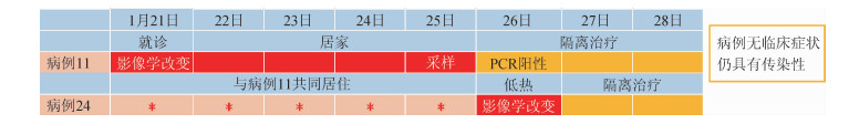 | 图 4 一起南昌市新型冠状病毒肺炎聚集性疫情中“病例11”家庭内传播时序图 |