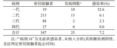 (4)密切接触者感染情况:密切接触者的总感染率为7.2%(25/347),其中,与一代病例D某一起聚餐共19人,10人发病,二代病例的密切接触者共213人,感染率为6.1%(13/213),三代病例的密切接触者共88人,感染率为2.3%(2/88),四代病例的密切接触者共27人,感染率为0.0%(0/27)(表 1)。
