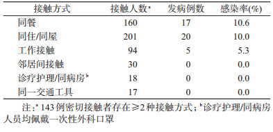 4.接触方式分析:密切接触者不同接触方式的分析结果显示,与病例同餐、同住/同屋、工作接触、邻居间接触、诊疗护理/同病房和同一交通工具的密切接触者感染率分别为10.6%(17/160)、10.0%(20/201)、5.3%(5/94)、0.0%(0/30)、0.0%(0/18)和0.0%(0/17)(表 2)。