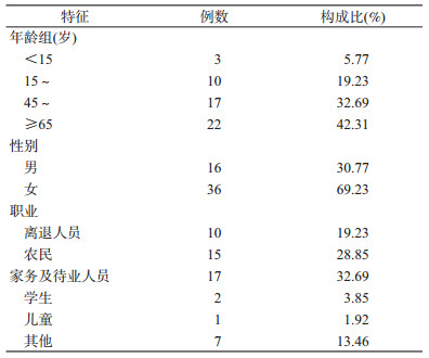结果1.基本特征:共调查15起聚集性疫情,共有确诊病例52例,涉及5例核酸阳性的无症状感染者。15起病例中有13起为家庭聚集性疫情,其中涉及病例最多的一起有12人,最少的有2人。52例确诊病例中,9例(17.31%)在1月22日前发病;37例(71.15%)在1月23日至2月4日发病;6例(11.54%)在2月5-20日发病。确诊病例年龄为(56.27±19.59)岁,以≥65岁为主,共有22例(42.31%),性别以女性为主,共有36例(69.23%)。病例主要集中在1月23日至2月4日,共有37例(71.15%)。职业分布以家务及待业人员为主,共有17例(32.69%),无医务人员感染。见表 1。