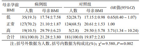 2.母亲孕前BMI比较:病例组母亲孕前BMI平均值为(21.28±3.80) kg/m2,高于对照组的(19.87±2.83) kg/m2,差异有统计学意义(χ2=9.580,P<0.05)。病例组母亲高BMI (BMI≥25.0 kg/m2)人数占10.5%,高于对照组(2.8%),低BMI (BMI<18.5 kg/m2)人数占19.3%,低于对照组(28.7%),高BMI组子代患孤独症的风险是正常BMI组的3.7倍(OR=3.71,95% CI:1.34~10.24)。见表 1。