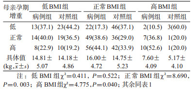 3.母亲孕期增重情况:低BMI母亲孕期过度增重与子代孤独症发病无关(χ2=0.411,P>0.05);病例组正常BMI母亲孕期增重均值为(16.00±4.72) kg,高于对照组的(14.75±5.23) kg,病例组母亲孕期高增重占44.1%,高于对照组(33.9%)。病例组高BMI母亲孕期增重均值为(7.60±4.09) kg,高于对照组的(5.17 ± 4.10) kg,病例组母亲孕期高增重占52.6%,高于对照组(20.0%)。正常BMI组和高BMI组中,母亲孕期增重程度与孤独症发病有关(正常BMI组χ2=8.690,P=0.003,高BMI组χ2=4.775,P=0.04)。见表 2。
