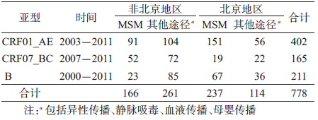 1. 序列收集和分析数据系列的建立:本实验室共获得北京MSM人群中HIV gag区基因序列80条,包含CRF01_AE亚型、CRF07_BC亚型、B亚型毒株。检索数据库,发现位于HIV基因组的906~1 446位(使用国际标准株HXB2定位)的基因序列最多。通过整理下载序列合并实验室已有序列,共获得来自中国背景信息明确的HIV基因序列778条,包含CRF01_AE亚型、CRF07_BC亚型、B亚型。其中北京MSM人群HIV-1基因序列237条、北京市其他传播途径人群HIV-1基因序列114条,非北京地区MSM人群HIV-1基因序列166条、非北京地区其他传播途径人群HIV-1基因序列261条(表 1)。共收集北京MSM人群的HIV-1毒株基因序列(gag区540 bp)237条,其中,CRF01_AE亚型毒株为151条(占63.7%);CRF07_BC亚型毒株为19条(占8.0%);B亚型毒株为67条(占28.3%)。