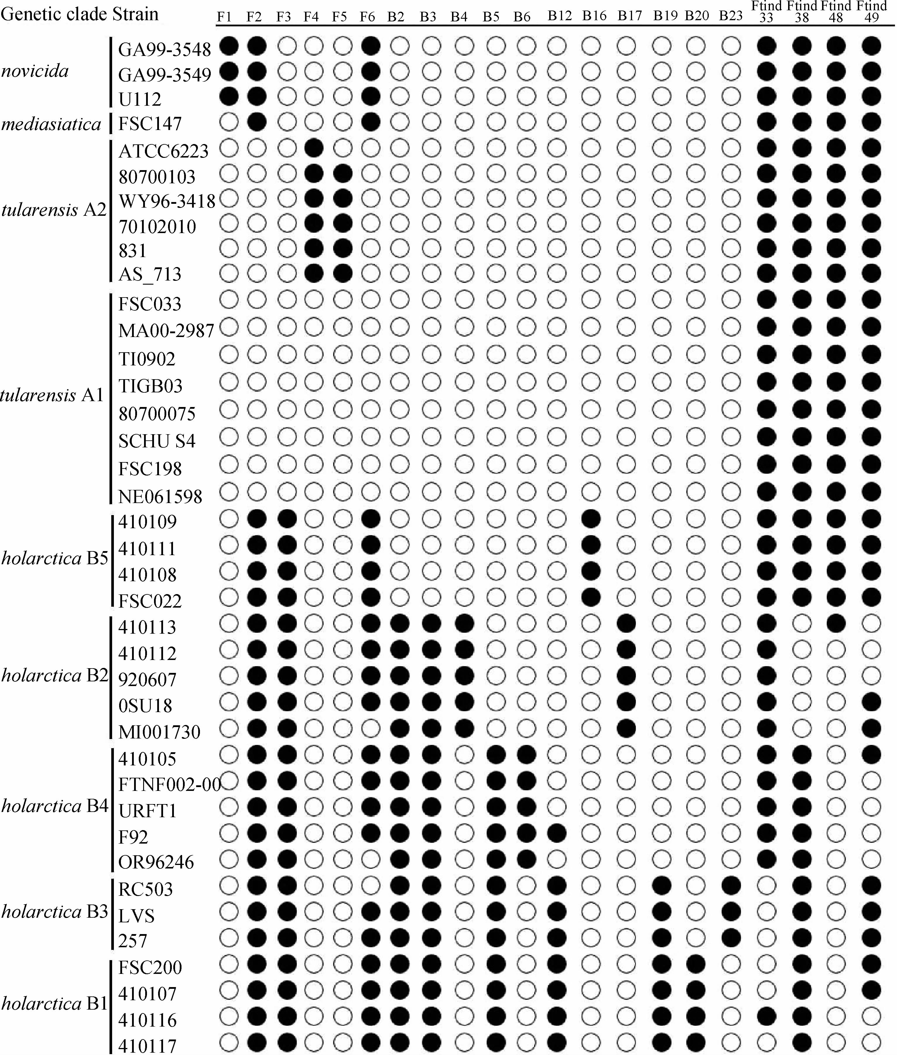 SNP-INDEL分析能够很好地将4个亚种区分出来,而且,不仅能够将A型的两个主要分支A1和A2区分开,对于B型也能够将日本土拉菌和北半球其他国家的土拉菌区分开(图2A)。从主干到分支的进化分析为:F1可以将subsp. novicida区分开;F2和F6可以将subsp. tularensis区分开;F3可以将subsp. holarctica区分开。在subsp. tularensis内,F4可以将A2区分出来,F5可以进一步将毒力弱的ATCC6223和其他A2菌株区分出来。引导分析的节点值大于50的,在节点左上方标出(图2),在节点的左下方标出了分型标记(图2A)。