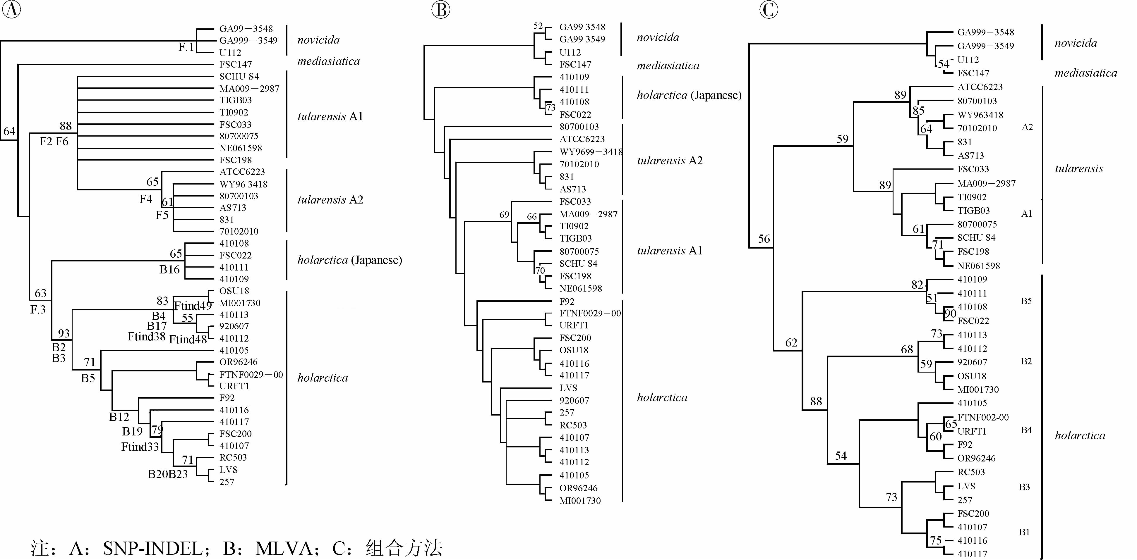 | 图 2 采用SNP-INDEL、MLVA单独和组合方法分析土拉菌之间的遗传进化关系 |