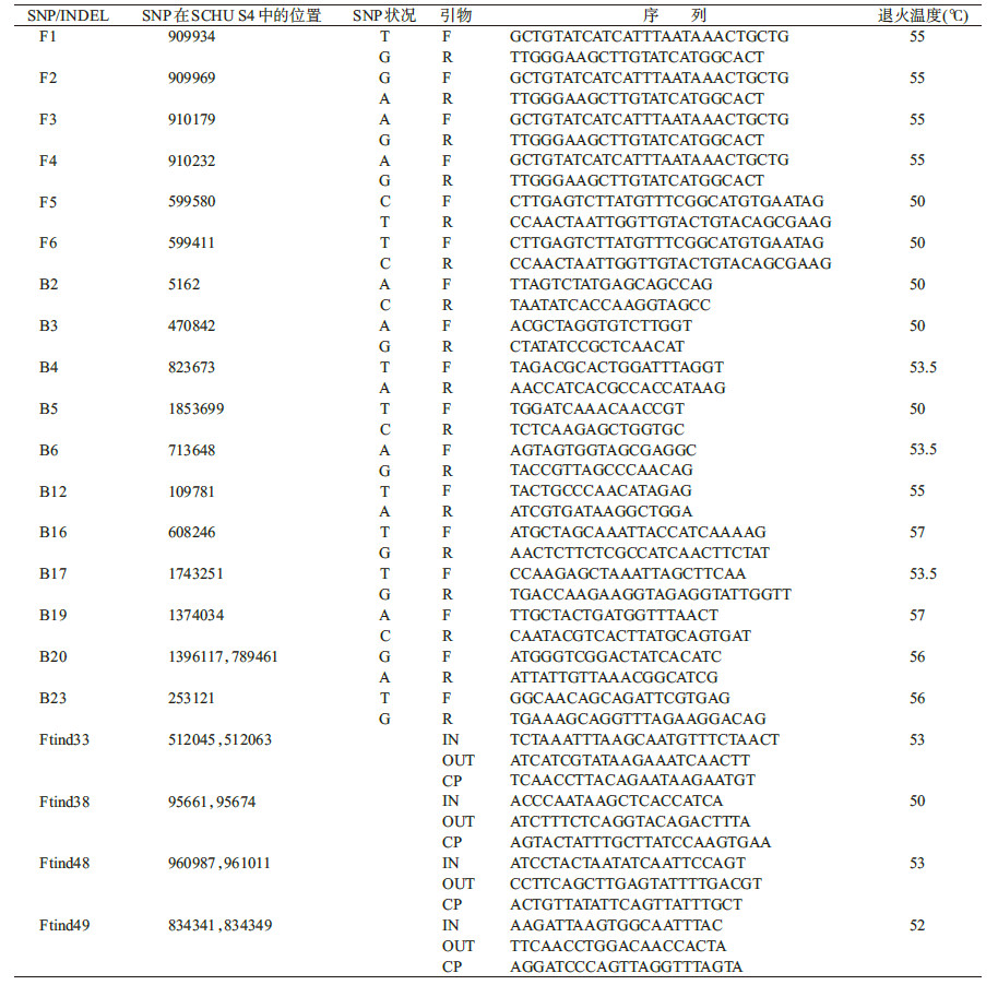 2. 选择适合的SNP和插入/缺失(INDEL):根据前期研究[7],从fopA和tul4基因中选出6个SNP位点(F1、F2、F3、F4、F5和F6)。从以往用于B型亚种分型的遗传标记中[2, 4],选择更有效力的11个SNP位点(B2、B3、B4、B5、B6、B12、B16、B17、B19、B20和B23)和4个INDEL位点(Ftind33、Ftind38、Ftind48和Ftind49),共21个遗传标记作为本研究的靶位点(表1)。为了获得准确的SNP信息,对于中国土拉菌,所有的SNP位点都通过测序获得,F1~F6位点SNP状况从以前的测序结果中得到[7]。每个INDEL位点均通过2对引物(CP-IN和CP-OUT)扩增以确定是否有插入片段的存在。CP-OUT引物作为阳性对照。对于29个测序菌株,在基因组序列中通过比对上下游引物,可以找到相应位置的SNP位点以及确定检测片段的插入和缺失。