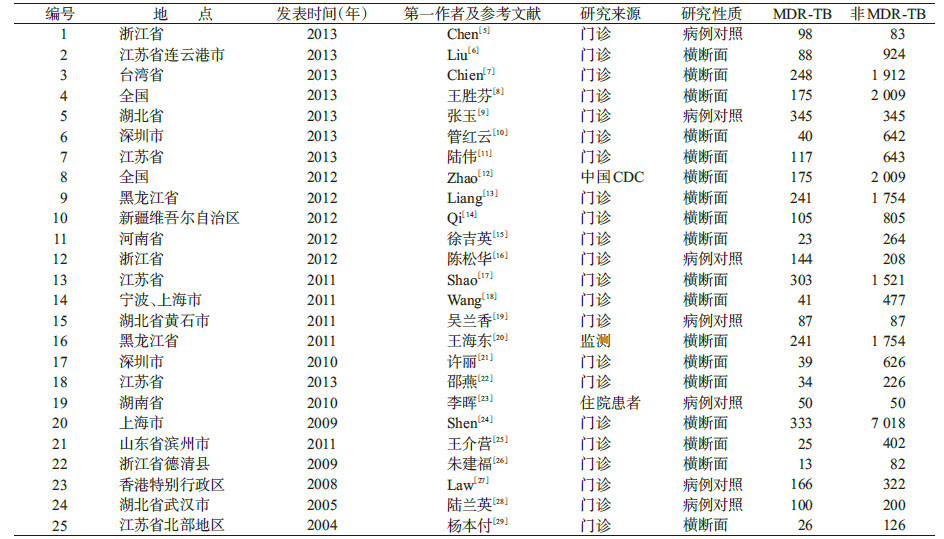 结核病(TB)严重危害人类健康和生命安全,随着抗结核药物的使用,耐药问题也随之出现,耐多药TB(MDR-TB)的诊断和治疗比敏感型TB困难得多,已成为TB控制的主要障碍之一[1, 2, 3]。目前学者对MDR-TB发病危险因素进行了大量研究。本研究对过去十几年发表的MDR-TB发病影响因素相关研究进行综合分析,估计其合并效应量,探讨MDR-TB发病主要危险因素,为其预防控制提供依据。