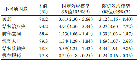 3. 主要危险因素的Meta分析:应用Stata 11.0软件进行异质性检验,民族、TB治疗史、肺部有无空洞、是否是流动人口、TB患者接触史和是否规律服药的检验结果显示,P<0.001,提示文献不同质,因此采用随机效应模型进行分析。居住地、家庭经济状况的异质性检验结果显示,P>0.05,提示研究文献同质,故采用固定效应模型进行合并(表3)。