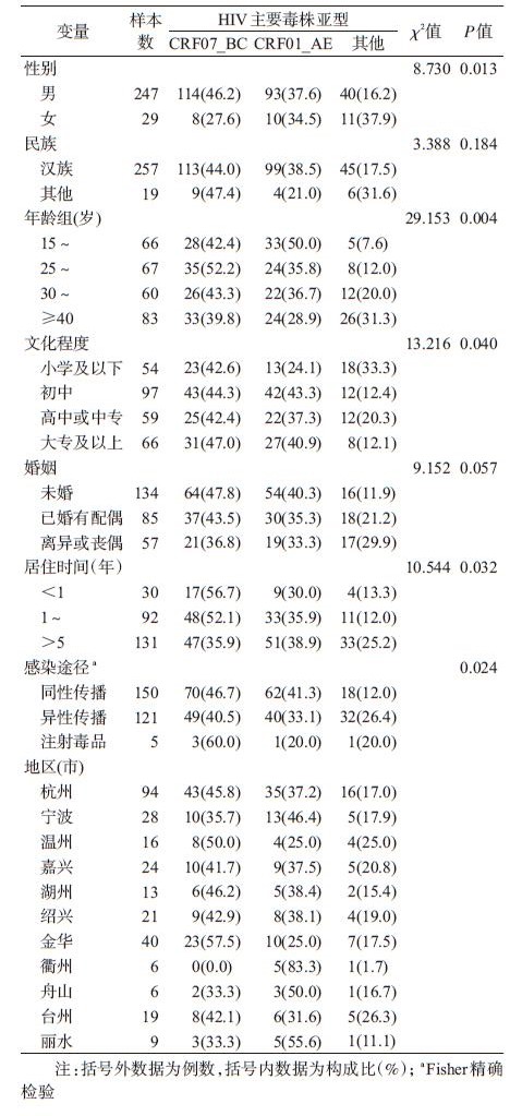 结果共收集到有效样本302例,占2015年浙江省报告HIV感染者总数12.3%(302/2 459)。成功获得序列276例,占样本数的91.4%。其中男性占89.5%(247例),汉族占93.1%(257例),年龄(35.8 ±13.9)岁;文化程度初中占35.1%(97例),大专及以上占23.9%(66例);未婚占48.6%(134例),已婚有配偶占30.8%(85例);同性性传播占54.3%(150例),异性性传播占43.8%(121例)。与2015年全省新报告HIV感染者构成相比,本次研究对象在民族、年龄、文化程度、婚姻状况和传播途径的构成,差异无统计学意义(χ2=1.528、3.56、0.046、0.822、4.427,P值均>0.05)。