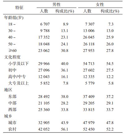 结果1.一般特征:调查总样本人数为176 534人,有效样本175 386人。其中男性74 957人(42.7%),女性100 429人(57.3%)。男、女性调查对象年龄M均为50~59岁。所有调查对象中,约有66.3%生活在东、中部地区,53.9%来自农村,79.5%为初中或初中以下文化程度(表 1)。