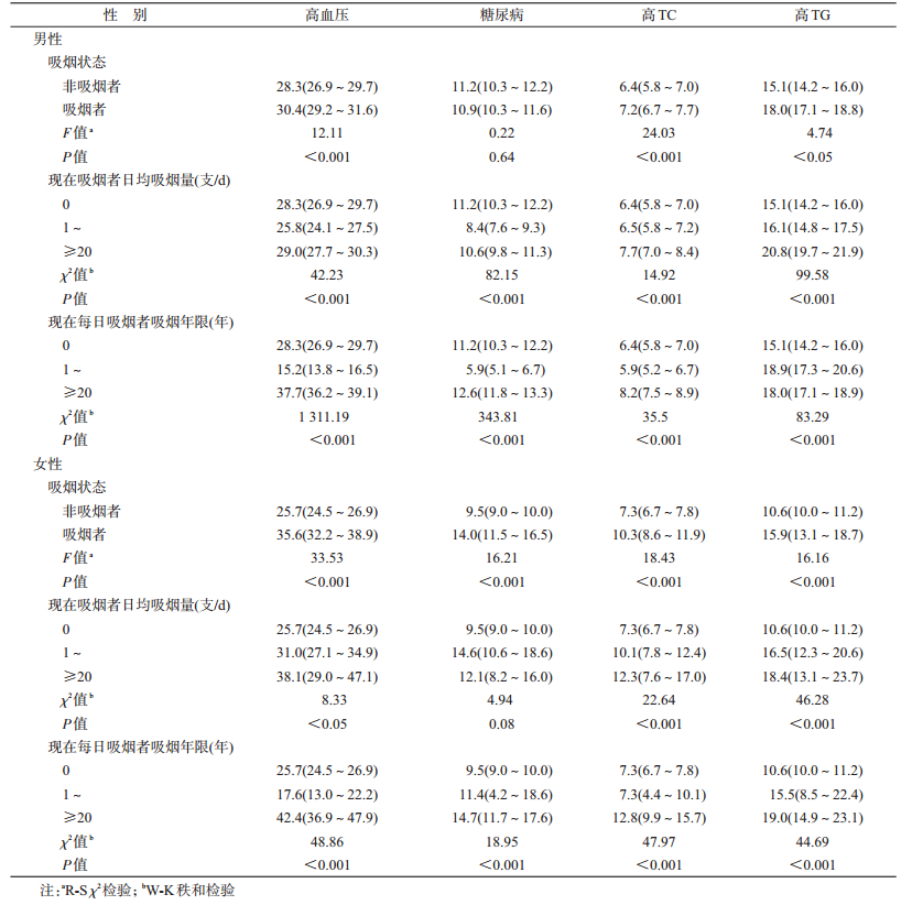 3.指标及相关定义:分析指标包括常见慢性病(高血压、糖尿病、血脂异常)流行率。高血压:2周内服用降压药,或SBP≥140 mmHg(1 mmHg=0.133 kPa)或DBP≥90 mmHg;糖尿病:被诊断患有糖尿病或FPG≥7.0 mmol/L或服糖后2 h血糖≥11.1 mmol/L;高TC血症:TC≥6.22 mmol/L(240 mg/dl);高TG血症:TG≥2.26 mmol/L(200 mg/dl)[10]。吸烟者为所有调查时吸烟及曾经吸烟的人;现在吸烟者日均吸烟量指调查时吸烟的人每日平均吸机制卷烟支数;现在每日吸烟者吸烟年限指调查时存在吸烟行为且每日吸烟的人开始每天吸烟的年数。