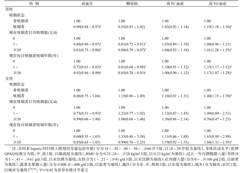 3.吸烟人群与多种慢性病患病关系:多因素分析结果显示,男性吸烟者高血压患病风险比非吸烟人群低10%;吸烟人群不同亚组中也发现高血压患病风险较非吸烟者有所降低。男性现在吸烟者和现在每日吸烟者糖尿病患病风险也低于非吸烟者。男性吸烟者患高TG血症风险比非吸烟者高19%。其中,现在日均吸烟≥20支男性高TG血症患病风险比非吸烟者高41%(表 3)。未发现女性吸烟与高血压、糖尿病及高TC血症患病风险间存在显著关联(表 3)。女性吸烟者比非吸烟者高TG血症患病风险高40%;其中,每日吸烟≥20年比非吸烟女性患病风险高60%。见表 3。