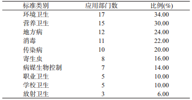 (1)公共卫生标准在调查部门中应用情况:公共卫生标准在调查部门应用前5位的类别分别是环境卫生、营养卫生、地方病、消毒和传染病,分别占34.00%、30.00%、24.00%、22.00%和20.00%。见表 1。