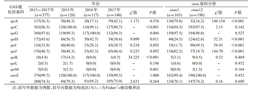A组链球菌(GAS)疾病谱比较广泛,可引起咽扁桃体炎、猩红热、皮肤感染,严重者还可引起侵袭性疾病如坏死性筋膜炎、链球菌感染中毒休克综合征以及风湿热、急性链球菌性肾小球肾炎等后遗症[1-2]。超抗原是迄今为止发现的能力最强的T细胞丝裂原,浓度不超过0.1 pg/ml的细菌超抗原就能够刺激T淋巴细胞引发机体发热,休克甚至死亡[2]。目前,在GAS中陆续发现的超抗原已达11种,分别是链球菌致热外毒素(streptococal pyrogenic exotoxis,spe) speA、speC、speG、speH、speI、speJ、speK、speL、speM、链球菌超抗原(streptococcal superantigen,ssa)、链球菌促有丝分裂外毒素(streptococcal mitogenic exotoxin Z,smeZ)[3]。其中speG,speJ,speZ由细菌的染色体编码,其余则由细菌细胞内的噬菌体编码,且部分超抗原存在多个等位基因[3]。speB和speF之前也曾被认为是超抗原家族的成员,但随后的研究证明这两种蛋白并不具备超抗原的促进淋巴细胞增殖特性[1, 3]。GAS致病力与链球菌超抗原密切相关[4-5]。超抗原谱在不同人群中、不同地区有较大差异,emm分型、PFGE和多位点序列分型等常用的检测方法无法反映出超抗原基因在细菌间的水平传播。超抗原分析可作为GAS检测方法的补充,进一步描述、鉴别GAS毒力是否增强、与特定感染是否相关等特征[3]。为了解北京市GAS超抗原携带现状及变化趋势,并分析其与emm基因型别及临床表现的相关性,本研究对2015—2017年北京市猩红热及咽部感染患者中分离到的GAS菌株进行M蛋白基因(emm基因)分型和超抗原基因检测分析,为指导猩红热及咽部感染的防控工作提供科学依据。