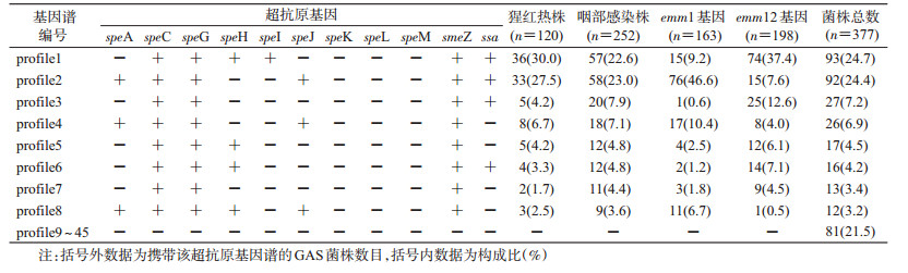 3. GAS超抗原基因谱分布情况:携带4~7个超抗原基因的菌株所占比例较高,仅4.2%(16/377)的菌株携带的超抗原基因≤3个,1.1%(4/377)的菌株≥8个。共检测到45种超抗原基因谱,分别命名为profile1~45,其中主要的8种基因谱编号分别为profile1~8(表 2)。携带profile1和profile2的菌株所占比例最高,分别为24.7%(93/377)和24.4%(92/377),其他基因谱所占比例均≤7.2%。profile1携带的超抗原为speC、speG、speH、speI、smeZ和ssa,profile2携带的超抗原为speA、speC、speG、speJ、smeZ和ssa(表 2)。