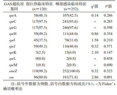 4.不同emm分型、不同临床特征病例(猩红热、咽部感染)病例GAS超抗原携带情况:在emm1型与emm12型菌株之间,携带speA、speH、speI和speJ基因的比例有差异(χ2=146.154,P<0.001;χ2=52.31,P<0.001;χ2=58.43,P<0.001;χ2=144.70,P<0.001)。emm1型携带speA和speJ基因的比例高达79.8%(130/163)、82.2%(134/163),而emm12型仅为16.2%(32/198)和18.7%(37/198);emm1型携带speH和speI基因的比例仅为24.5%(40/163)、11.7%(19/163),而emm12型较高,达到62.6%(124/198)和49.5%(98/198)(表 1)。在致咽部感染和致猩红热菌株之间,携带超抗原基因的比例差异均无统计学意义(P>0.05)(表 3)。