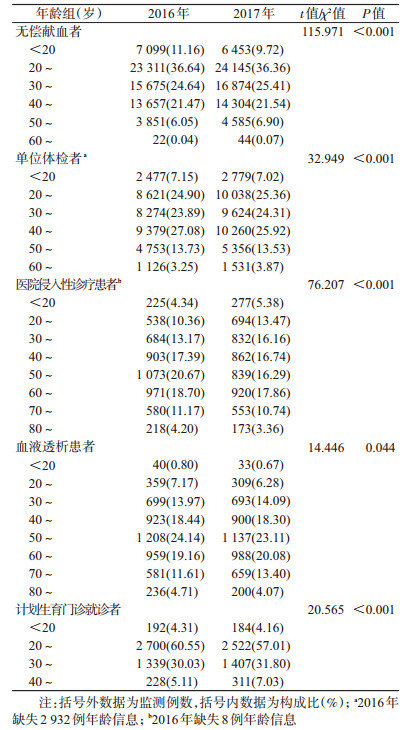 (1)无偿献血者:2016年31个哨点监测63 615人,年龄(31.93±10.53)岁,20~49岁占82.75%;男性40 242人(63.26%),女性23 373人(36.74%)。2017年31个哨点监测66 405人,年龄(32.38±10.69)岁,20~49岁占83.31%;男性43 130人(64.95%),女性23 275人(35.05%)。