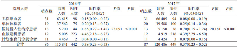 结果1.一般情况:2016年有86个哨点完成监测,监测人数为115 841人,HCV总阳性检出率为0.38%(442/115 841,95%CI:0.23%~0.53%)。2017年有87个哨点完成监测,监测人数为120 486人,HCV总阳性检出率为0.37%(449/120 486,95%CI:0.23%~0.52%)。见表 1~3。