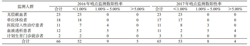 2016、2017年检出HCV抗体阳性者分别为2例、3例,阳性率为0.04%(95%CI:0.00%~0.11%)、0.07%(95%CI:0.00%~0.15%),见表 3。2016、2017年分别有2、3个哨点检出HCV抗体阳性,其中检测HCV抗体阳性率均<1.00%,见表 4。